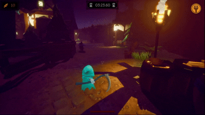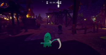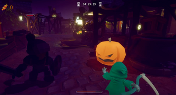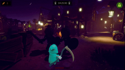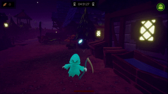 Armed with your oversized scythe and ghostly energy blasts, you prowl a stylized village to ruin Halloween — one terrified kid at a time.